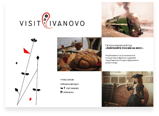 Делимся элементами фирменного стиля, который мы разработали для Центра развития туризма Ивановской области. Про сайт visitivanovo рассказываем в отдельном кейсе.